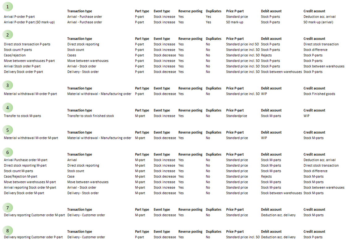 In the table below you find an example of how to create posting methods for stock transactions according to the numbered arrows above. In the example, posting of standard prices are applied as well as SO mark-up for purchased parts. Separate stock accounts are used for purchased and manufactured parts. Which stock account will be used is determined by the Part type. However, it is possible to use other fields for the part to determine this. If you have a shared stock account, the number of registered posting methods can practically be reduced by 50%. However, if you have many stock accounts due to warehouses, you need to increase the number of posting methods. There should be one flow per warehouse/stock account. This can be solved by using warehouse as Other terms on the posting methods.