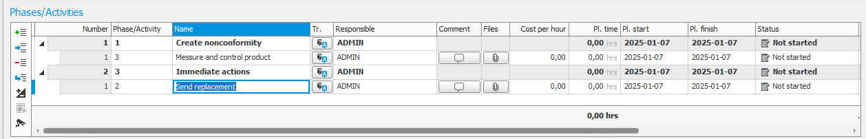 Predefined phases or activities and costs for a case type are by default loaded to a new case. The default phases, activities, and costs configured per case type can be changed in connection with the registration of a new case. If a lead time has been entered for the activities in the basic data you will also receive a planned "throughput time" for the case. You can then go to the Header and Costs tabs to change, add, or delete phases/activities and costs for the case in question. All information items for the activities can be updated. For each activity, you can indicate a date when it should be finished and who is responsible for it.