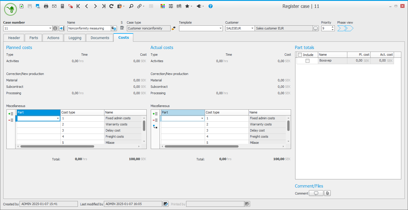 All information items regarding other costs (costs which are not linked to activities or are loaded from a linked manufacturing order) can be updated under the Costs tab. It is possible to add or delete rows. You can select if the cost should be charged (regarding supplier nonconformity) and this means that the registered cost will not be seen as a cost of poor quality in your analyses.
