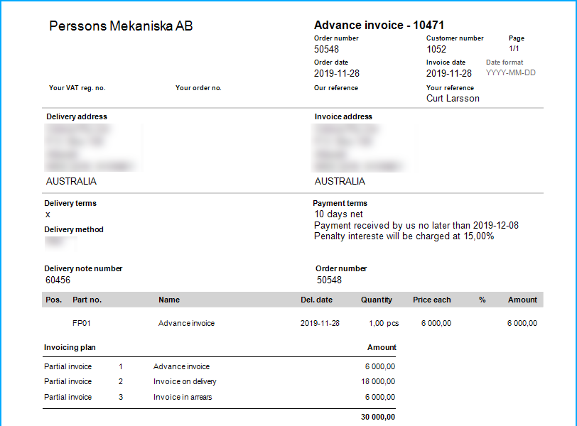 The advance invoice can also contain text information from the customer order such as for example order rows, goods label, etc. This is determined via the setting Invoice text on advance invoice/invoice in arrears on the invoicing plan in the Invoicing plans procedure.