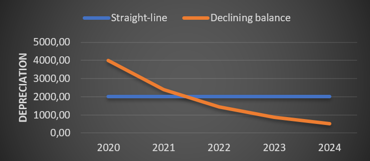 The declining balance depreciation method calculates the depreciation based on the object’s residual value, with a higher rate of depreciation at the start of the object’s financial life, which gets lower over time.