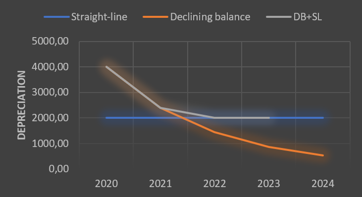 This method is a combination of Straight-line and declining balance depreciation, and is used in Poland, for example. With this method, the depreciation starts with the declining balance method until the value reaches the point where the straight-line method is higher. The method is then changed to straight-line depreciation.