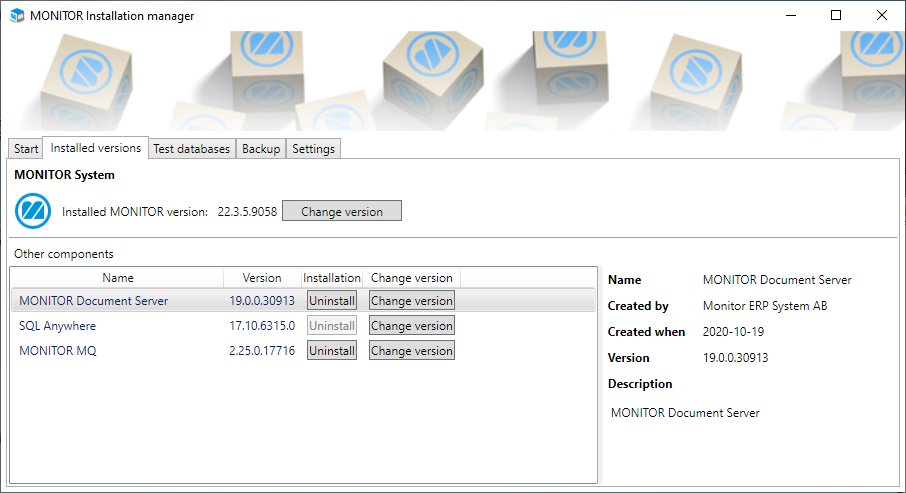 Under the tab Installed versions you will see the currently installed version of Monitor ERP. Here you install updates of Monitor ERP via the Change version button. Under this tab you also install and update other components in the system, via the buttons Install and Change version in the section Other components. Next to each installed component you see the current version. If a component is not installed it will say Not installed.