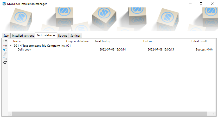 Under the Test databases tab you can create test databases and copying tasks. When creating a test database or when creating a copy task, it is possible to activate scheduled copying of actual database to test database. You can run the copying task manually from here. For scheduled copying tasks you can update the scheduling, which is saved in the Task Scheduler in Windows.