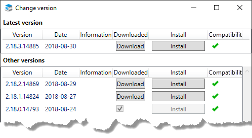 Click the Install button in order to install the version. You can also click the button Download if you only want to download a version. After the download, a filled checkbox shows that the version is downloaded. You should then click the Install button in order to install the version.