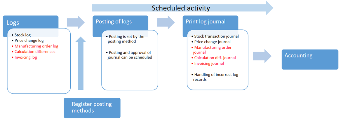 The posting is not made in real time in connection with the reporting but is instead made regularly via a built-in scheduling function. Also the transfer of log journals and their posting to the accounting, can be made automatically via the built-in scheduling function. The scheduling can be set to take place at a specific time or by using fixed intervals (for example every sixth hour or after 10.00 PM each day).