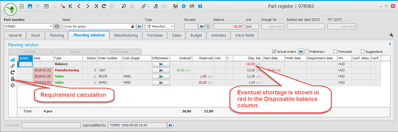 1. Work method – Part register – For an individual part you open a planning window in order to analyze your requirements and discover shortages. This is the decision basis for manual registration of manufacturing and purchase orders. This is called the manual method. This method is also used together with the other methods.