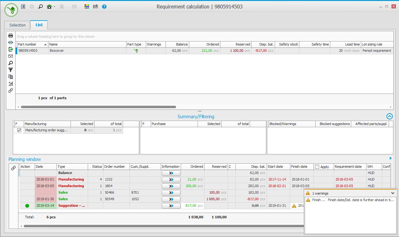 3. Work method – Net requirement calculationClosed You use the net requirement calculation to perform requirements planning based on the customer order backlog, as well as any existing sales forecasts. – Works its way through all levels during one and the same run/calculation. After the run/calculation, order suggestions are shown in separate suggestion lists. The net requirement calculation generates order suggestions without displaying "why". This method is called the automatic method.