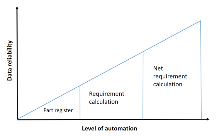 The demands regarding basic data, correct order backlogs, and stock balances increase as the level of automation increases. See the image below.