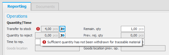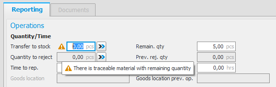 When you report an operation which has traceable material, the traceable material will in normal cases not be deducted automatically from the balance of the location. However, this can be activated via the Allow automatic withdrawal setting in the Part register. If the traceable material is not already reported, a warning will be shown when you report parts of the planned quantity on the operation. The warning is a reminder that the traceable material should be reported as soon as possible.