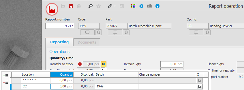 When you report the final operation with a quantity entered, a transfer to stock takes place – this is roughly the same as when arrival reporting a purchase order. By default the manufacturing order number is suggested as batch number. But you can enter any batch number you please.