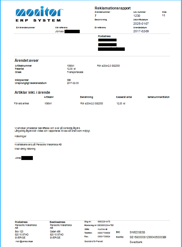 När en leverantörsavvikelse är registrerad går det att skriva ut en reklamationsrapport för att skicka till leverantören. Rapporten innehåller data samt en beskrivande kommentar om ärendet.