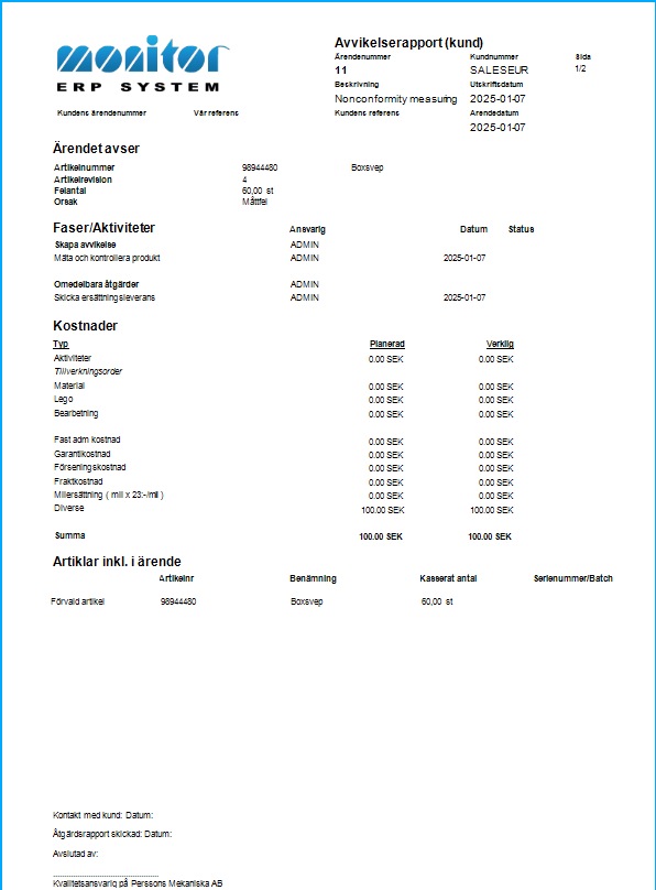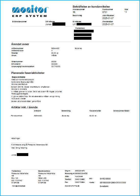 När en kundavvikelse är registrerad går det att skriva ut en bekräftelse på mottagen reklamation och skicka till kunden. Detta gör du i fliken Dokument. Denna bekräftelse innehåller uppgifter om ärendenummer, den egna handläggaren och vilka aktiviteter som är planerade och utförda. Endast aktiviteter som markerats med Ut kommer att skrivas ut på bekräftelsen. Sist i dokumentet visas vilka artiklar som är inkluderade i ärendet.