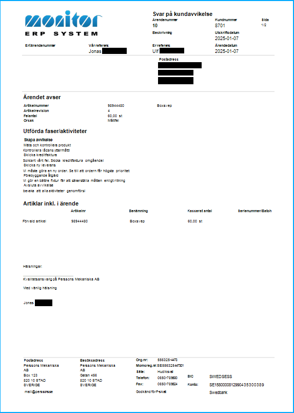 När en kundavvikelse slutbehandlats kan det vara lämpligt att skriva ut ett svar och skicka till kunden. Svaret innehåller uppgifter om kundens och det egna ärendenumret, den egna handläggaren, artiklar inkluderade i ärendet samt eventuellt en kommentar i textform.
