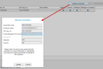 Du kan göra en manuell anslutning om du med säkerhet vet att kunden vill och kan ta emot e-faktura, men då kunden inte är synlig/tillgänglig när du söker efter den i Crediflows mottagarregister. Funktionen syftar till att kunna ansluta tyska kunder som vill ta emot fakturor i ZUGFeRD-format eller som har ett Leitweg-ID (B2G).