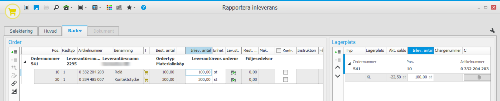 Om inleveransen ska genomgå mottagningskontroll får orden status Ankommit efter att du rapporterat inleveransen. I det fallet hämtas sedan ordern upp i rutinen Mottagningskontroll, där pallflaggor skrivs ut och lagersaldot uppdateras.
