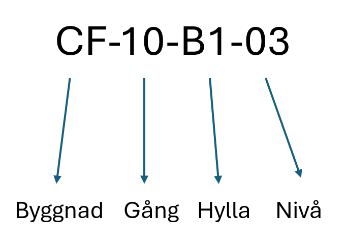 Exempel på hur lagerplatsnamn (koordinater) kan vara uppbyggda.