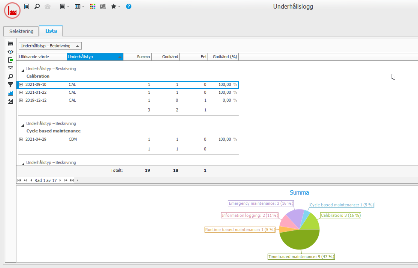 Rutinen Underhållslogg visar historiken på rapporterade underhåll och kalibreringar. Det finns en detaljerad och en summerad listtyp med olika presentationer för att följa upp utförda underhåll.
