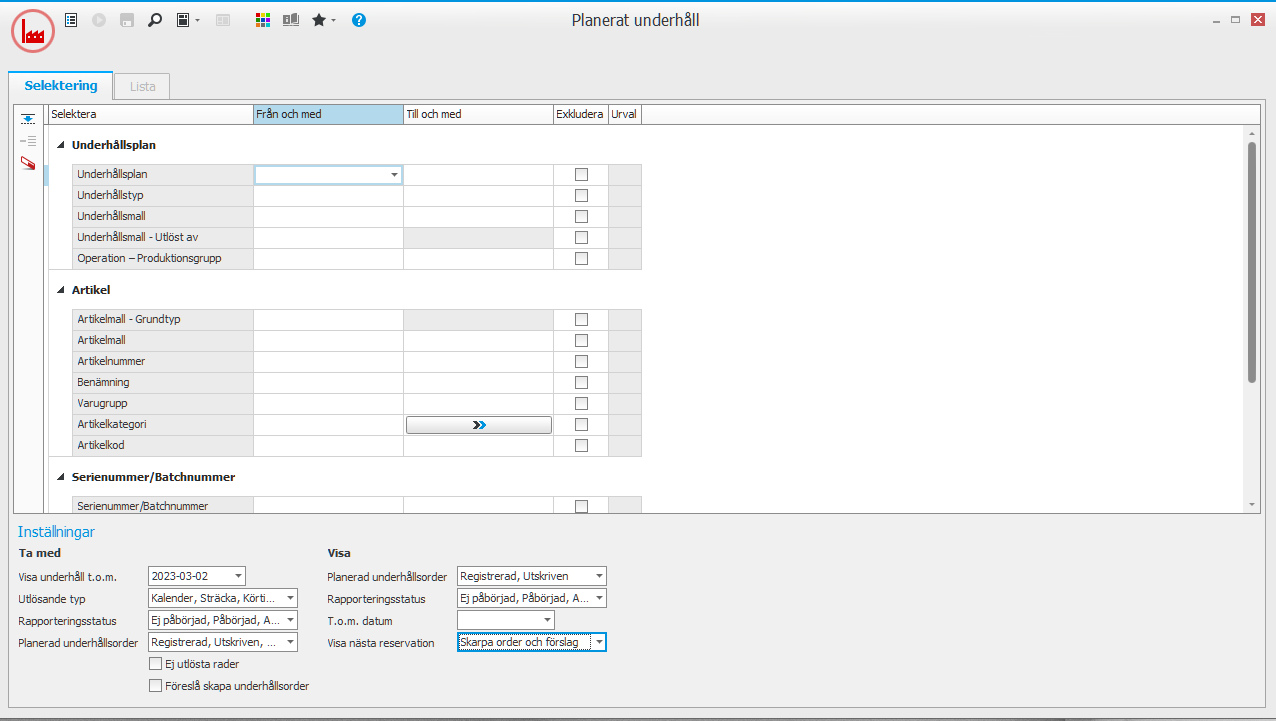 Tips! Genom att kryssa ur alla alternativ i Utlösande typ under Inställningar, visas alla underhåll även om inte gränsen är passerad. Det ger en bra sammanställning över hela underhållsupplägget.