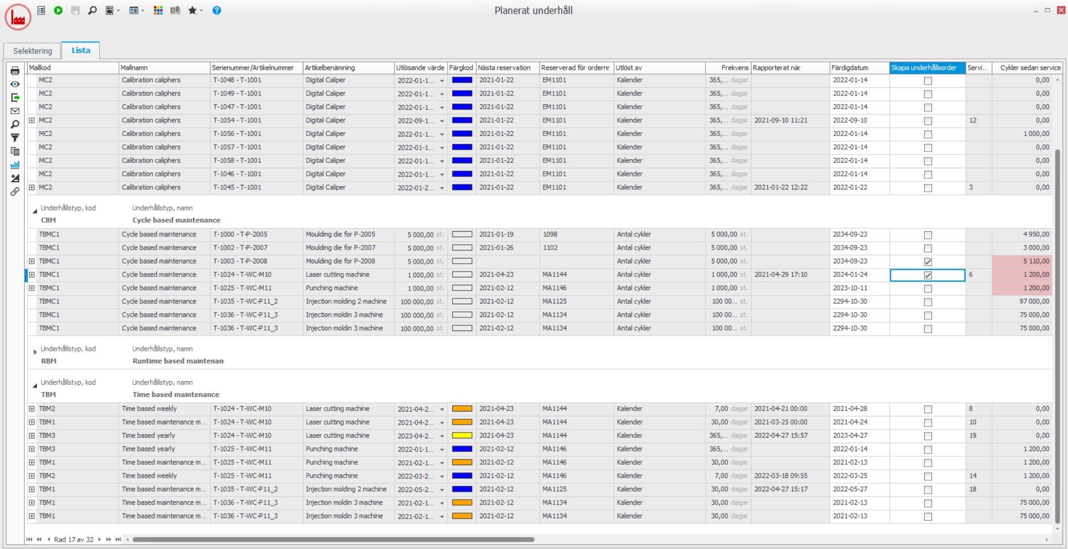 När du hämtat listan visas de verktyg som är dags att underhålla eller kalibrera antingen för att något av dess räkneverk har passerat gränsen för det valda underhållet eller för att antal dagar passerat. Listan innehåller många kolumner med information. Bland annat visas var verktyget är placerat och om det används av någon order just nu.