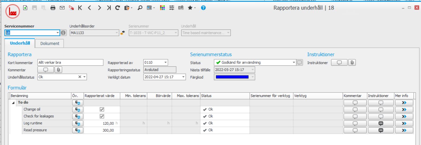 Vid rapporteringen används det formulär som är kopplat till underhållet. Om formuläret innehåller rader fyller du i rapporterade värden och radernas status uppdateras från det. Rader som är kryssrutor rapporteras bäst genom att sätta status på dem, då kryssas rutan i automatiskt. Om du ändrar underhållsstatus på hela formuläret visas en kontrollfråga om de rader som inte är rapporterade också ska rapporteras. Du kan också skriva en kommentar till varje rads rapportering och se instruktioner per rad.