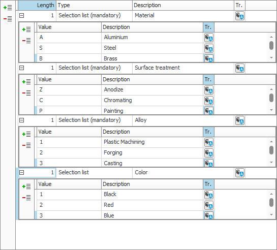 In the image below, you see how a part is categorized by using the four category items in the image above. The categorization indicates that it is a part made out of aluminum (position 1), anodized (position 2) in wrought alloy (position 3), in black color (position 4).