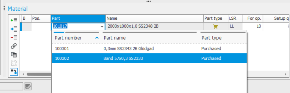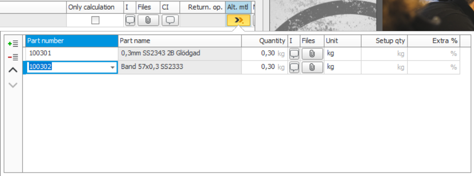 There are lists that can be updated in the Material list procedure and in the Part list procedure, where alternative materials in BOM and routing and the Part register can be handled. You can also import alternative materials to the BOM and routing via the Part import procedure.