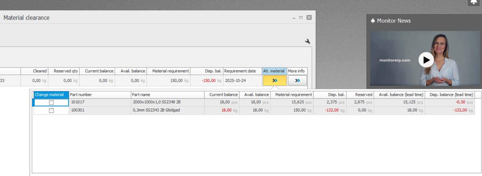 In the Material clearance procedure, there is a section displaying which alternative materials can be used and Monitor ERP will take into consideration if that material will be needed for other orders within the lead time.