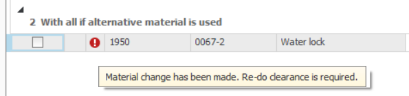When an alternative material is used, a symbol will be displayed indicating that the material clearance needs to be run again. After this is done, you execute the part replacement/change and the clearance by saving the material clearance.