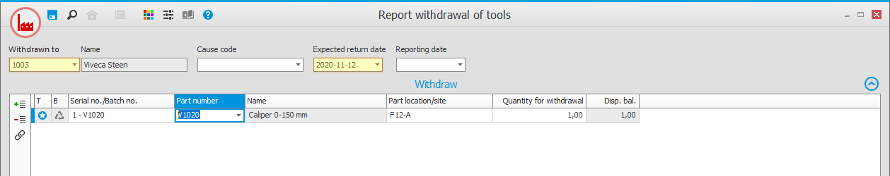 To keep track of tools that are not linked to BOM and routing but are withdrawn to different persons, you find functions used for manual withdrawal and return of tools in the procedure Report withdrawal of tools.