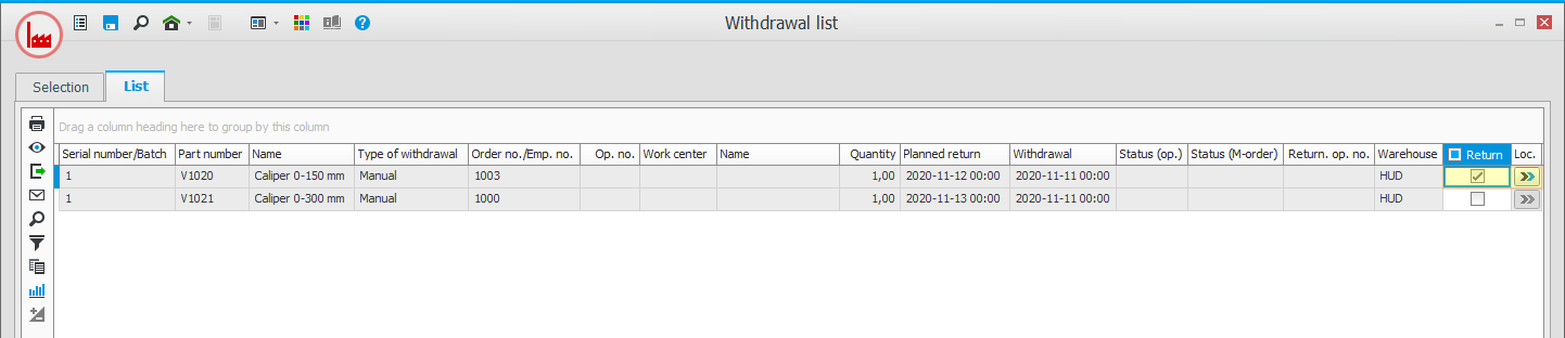 - Report the return by marking the Return box in the list. You can also see and select to which location Loc.