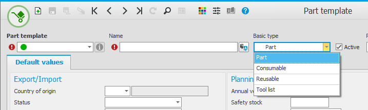 - Reusable – This is probably the most frequently used basic type. Tools of this type are handled via withdrawal from and return to stock. Reusable is always used if you want to perform maintenance and calibration. Then you must also use traceability on serial number, which is added in the part template. You can create several part templates for different types of tools, for example, measuring tools, fixtures, and machines.