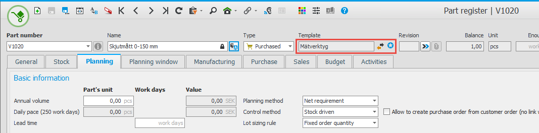 In the Part template procedure, you find basic types for tools. To be able to handle tools, you must first create part templates for the types of tools and equipment that you want to use. You must create at least one template per basic type.