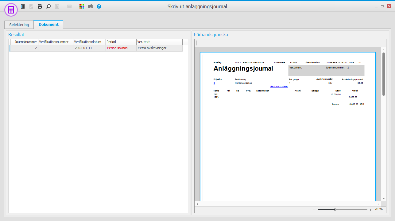 Det går att skriva ut journaler för avskrivningar och deras konteringar. Journalerna kan granskas och därefter godkännas. De förs då över till redovisningen. I många fall skriver företag även ut journal/bokföringsorder till skrivare och sätter in den i verifikationspärmen. Denna tillämpning med anläggningsjournalen behövs enbart om integrationen till redovisningen går via utskrift av journal.